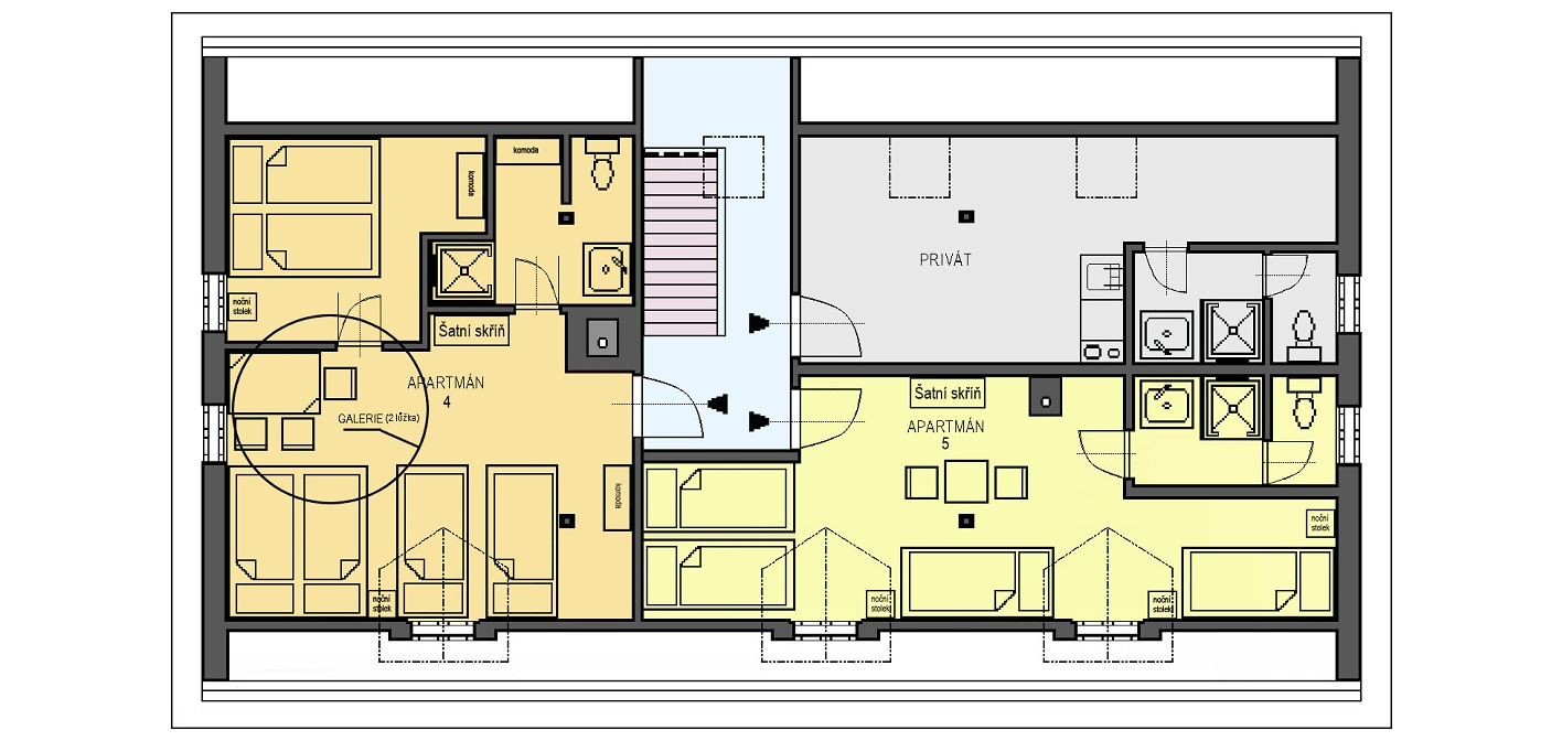 Apartmán, který se nachází ve druhém patře nabízí dva pokoje a celkem osm pohodlných lůžek. První pokoj nabízí šest lůžek, z toho 2 v mezipatře, zatímco druhý pokoj nabízí dvě lůžka. K dispozici budete mít pohodlí vlastní koupelny se sprchou a toaletou.